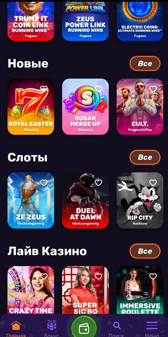 • Карточные игры, рулетка, азартный развлечение в формате Live.